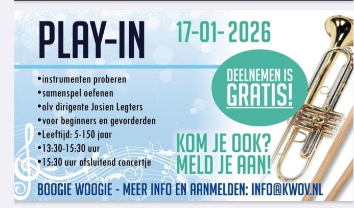De Koninklijke Winterswijksche Orkest Vereeniging (KWOV) houdt op zaterdagmiddag 17 januari 2026 weer een Play-In voor iedereen die houdt van muziek. Dit muzikale evenement vindt plaats in Boogiewoogie, staat onder leiding van dirigente Josien Legters en deelname is volledig gratis.Tijdens de Play-In kunnen belangstellenden verschillende instrumenten uitproberen, onder andere de klarinet, fluit, trompet, bariton, trombone, hoorn, saxofoon en slagwerk zijn aanwezig.Er is geen muzikale ervaring vereist; dus of iemand nou nog nooit een noot gespeeld heeft, of juist in het verleden al muziek heeft gemaakt en het weer op wil pakken; iedereen is welkom!Voor leeftijd geldt hetzelfde: zowel kinderen als volwassenen kunnen deelnemen, waardoor ook de combinatie van bijvoorbeeld ouder en kind heel geschikt is.Het programma begint om 13.30 uur en duurt tot 15.30 uur, waarna er een afsluitend concert plaatsvindt om 15.30 uur, waarin de liedjes die aanwezigen die middag hebben geoefend uitgevoerd worden. Wie er bij wil zijn kan zich aanmelden via info@kwov.nl.Dit is een geweldige kans om muziek te maken, nieuwe mensen te ontmoeten en samen plezier te beleven.Vanaf 23 februari start de KWOV weer met een nieuwe serie “Music4All”. Hierin worden 6 lessen gegeven op een instrument naar keuze voor slechts 10 euro. Meer informatie hierover volgt op de website www.kwov.nl.Meer informatie is op te vragen via: info@kwov.nl